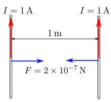 Ампер — сила неизменяющегося тока, который при прохождении по двум параллельным прямолинейным проводникам бесконечной длины и ничтожно малой площади кругового поперечного сечения, расположенным в вакууме на расстоянии 1 метр один от другого, вызвал бы на каждом участке проводника длиной 1 метр силу взаимодействия, равную 2⋅10−7 ньютона.
