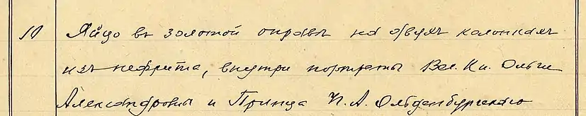 Долгие годы специалисты не могли сформировать однозначного мнения относительно данного пасхального яйца, пока в 2015 году в исследовании предмета не произошел настоящий прорыв. Это произошло благодаря обнаружению и изучению уникального источника — «Списка собственным вещам вдовствующей Императрицы Марии Федоровны, находившимся на хранении в Гатчинском Дворце» от 28 июля 1917 года. Этот документ, впервые опубликованный еще в 2013 году[4], на 12 страницах описывает 150 различных предметов, принадлежавших вдовствующей императрице Марии Федоровне, в том числе и императорское пасхальное яйцо "Ампир" 1902 года (за номером 10, на второй странице документа). Запись о предмете следующая: «Яйцо в золотой оправе на двух колоннах из нефрита, внутри портреты Вел. Кн. Ольги Александровны и Принца П. А. Ольденбургского». Это описание является самым точным из имеющихся на настоящий момент. Таким образом, миниатюрный портрет Александра III рассматривался как сюрприз яйца ошибочно.