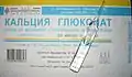 Стеклянная ампула с остроконечным носиком требующим надпила при вскрытии с инъекционным раствором кальция глюконата и картонная упаковка на 10 ампул
