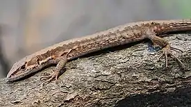 Небольшая ящерица достигающая 20 см в длину. Большую часть составляет хвост (не менее двух третей). Туловище обычно не превышает 7-8 см. Верх тела коричневый, зеленовато-голубой или серо-оливковый, иногда с неправильными тёмными пятнами на спине. По бокам спины проходит широкая тёмная полоса. По бокам шеи до воротника — короткая светлая узкая полоска. Низ тела синевато-зелёный или зеленовато-серый. Молодые особи полностью чёрные[3].