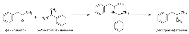 При необходимости, стереоизомеры амфетамина — декстроамфетамин и левамфетамин — могут быть разделены с применением битартрата калия. Кроме того, опубликован метод стереоселективного синтеза декстроамфетамина, который заключается в восстановительном аминировании фенилацетона с помощью S-α-метилбензиламина. Полученный таким образом имин восстанавливается никелем Ренея и рекристаллизуется в виде гидрохлорида. После этого N-бензильная группа подвергается гидрогенолизу в присутствии палладия на угле с образованием декстроамфетамина высокой оптической чистоты[24].