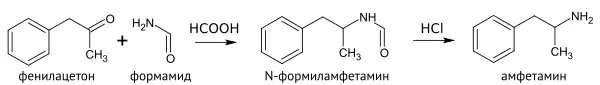 Одним из самых распространенных способов нелегального производства амфетамина является реакция Лейкарта, заключающаяся в конденсации фенилацетона (фенил-2-пропанона, P2P) с формамидом или формиатом аммония в присутствии муравьиной кислоты и последующем кислотном гидролизе образовавшегося N-формиламфетамина[6].