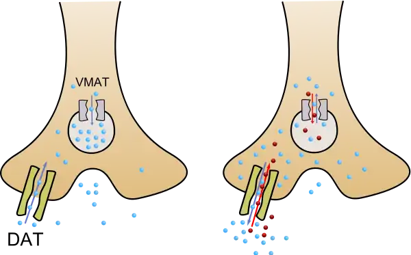 Действие амфетамина основано на увеличении выброса катехоламинов, в особенности дофамина и норадреналина, из пресинаптических окончаний. При нормальной работе дофаминергического синапса выброс дофамина в синаптическую щель осуществляется посредством экзоцитоза везикул, содержащих дофамин. После этого происходит обратный захват дофамина в клетку: транспортер DAT (дофаминный транспортер) перемещает дофамин из синаптической щели в цитоплазму, а транспортер VMAT (везикулярный транспортер моноаминов) — из цитоплазмы в везикулу. При проникновении в клетку амфетамина транспортеры начинают работать в противоположном направлении, перемещая дофамин из везикулы в цитоплазму и далее в синаптическую щель. В результате концентрация дофамина в синаптической щели возрастает, хотя обычный (везикулярный) механизм выброса нейромедиатора уменьшается[10][11].