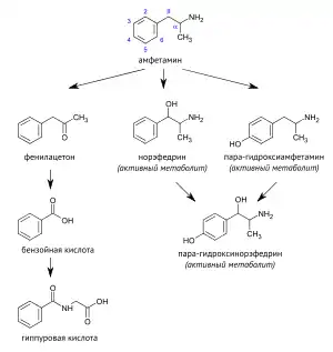 Основным путём метаболизации является дезаминирование амфетамина с образованием неактивного метаболита, фенилацетона (P2P), который затем окисляется до бензойной кислоты и выводится в виде гиппуровой кислоты или подвергается конъюгации с глюкуроновой кислотой и выводится в виде глюкуронида. Помимо этого, амфетамин также подвергается гидроксилированию в позиции β и 4-й позиции ароматического кольца с образованием норэфедрина и пара-гидроксиамфетамина соответственно, которые затем частично гидроксилируются до пара-гидроксинорэфедрина. Норэфедрин, пара-гидроксиамфетамин и пара-гидроксинорэфедрин являются активными метаболитами. В процессе фазы II метаболизации метаболиты, гидроксилированные по ароматическому кольцу, также подвергаются конъюгации с образованием глюкуронидов[22][23].