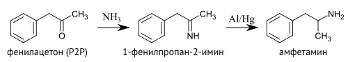 Амфетамин также может быть получен восстановительным аминированием фенилацетона в присутствии металлического катализатора. Реакция проходит с образованием промежуточного имина[6]. Примерами реакции являются: