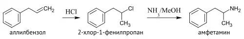 Амфетамин может быть получен реакцией аллилбензола с соляной кислотой с образованием 2-хлор-1-фенилпропана, который затем подвергается действию раствора аммиака в метаноле[24][25].