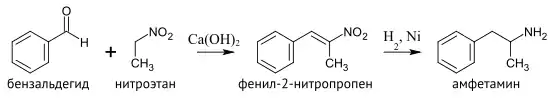 Ещё одним способом синтеза амфетамина является конденсация бензальдегида с нитроэтаном в присутствии гидроксида кальция с образованием фенил-2-нитропропена, который затем восстанавливается водородом (на никелевом либо палладиевом катализаторе) или алюмогидридом лития[6][24].
