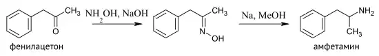 - Реакция фенилацетона с гидроксиламином в слабощелочной среде с образованием промежуточного оксима, который затем восстанавливается натрием в присутствии метанола (именно такая реакция была предложена в патенте Smith, Kline & French 1930 года), алюмогидридом лития или в присутствии палладиевого катализатора[6][24].