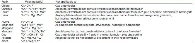 Опционально добавляются ещё префиксы для описания различных вариаций состава и структуры. В случае нескольких префиксов они добавляются поочерёдно в соответствии с общей формулой амфиболов.