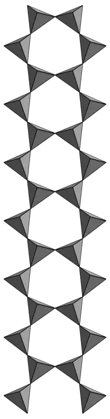 Основой кристаллической решетки амфиболов являются сдвоенные цепочки (ленты) кремнекислородных тетраэдров, формула радикалов [Si4O11]6-. Радикалы соединены гидроксильными ионами ОН-, которые могут замещаться F-, реже Cl-. [3]