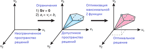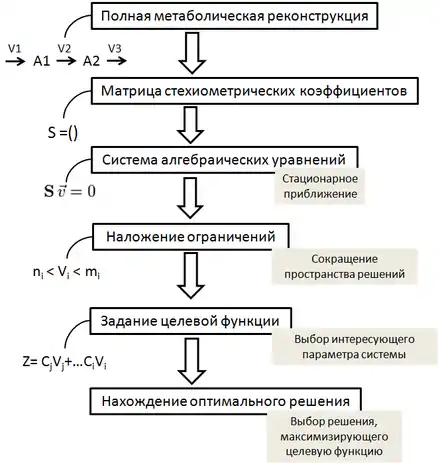 Говорят, что любое , удовлетворяющее уравнению обращает в ноль размерность пространства . Но в любой реалистичной метаболической модели количество реакций всегда больше, чем количество метаболитов (n > m). Другими словами, количество неизвестных больше, чем количество уравнений, следовательно, не существует однозначного решения такой системы, причем многие решения могут быть совершенно неподходящими с биологической точки зрения. Однако пространство решений можно ограничить, и искать решение, отвечающее некоторому критерию. Этот критерий задается так называемой целевой функцией, которая отражает некоторый параметр системы, и ищут решение, при котором эта функция имеет, например, максимальное значение. Кроме того, пространство решений сильно ограничивается наложением ограничений на каждый поток. Таким образом, например, можно рассчитать какая точка в пространстве решений соответствует максимальной скорости роста или максимальному выходу АТФ в определённом организме исходя из наложенных ограничений. (Рис. 1)