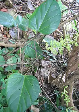 Это крупная вечнозелёная лиана с деревянистым стволом, диаметром до 15 см Листья очередные крупные кожистые черешковые широкоовальные. Цветки мелкие невзрачные, собраны в крупные многоцветковые метёлки. Плоды — костянки, созревающие по 200—300 штук в каждой метёлке. Семя одно, почковидно-изогнутой формы, с маслянистым эндоспермом.