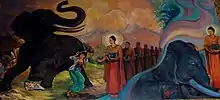 Однажды, действуя по указанию Девадатты, королевские погонщики напоили допьяна слона Налагири и выпустили его на тропу Будды, чтобы тот затоптал его насмерть. Ананда, завидя несущееся к ним разъярённое животное, сразу же встал между ним и Буддой. Три раза Будда запрещал ему это делать, но обычно послушный Ананда отказался двинуться с места, и, согласно преданию, Будда чудесным образом заставил землю откатиться назад, чтобы убрать Ананду с дороги слона. А затем силой своего дружелюбия успокоил взбешённого Налагири[12][25].