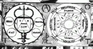 Символ А в круге можно встретить ещё в книге Штефан Михельспахер Spiegel der Kunst und Natur (Зеркало искусства и природы), опубликованной в Аусбурге в 1615 г. Это была работа по алхимии, написанная под влиянием взглядов Агриппы на Каббалу и магию. Адам МакЛин описывает центральную часть рисунка как «две диаграммы с немецким GOTT (Бог), расположенным по углам и буквами альфа и омега, а также монограммой, которая может означать имя Бога, Agla.» Это означает начало — альфу, и конец — омегу (первую и последнюю буквы греческого алфавита) и восходит к Книге Откровения, где говорится, что Иисус есть «Альфа и Омега, Начало и Конец, Первый и Последний» (22:13).