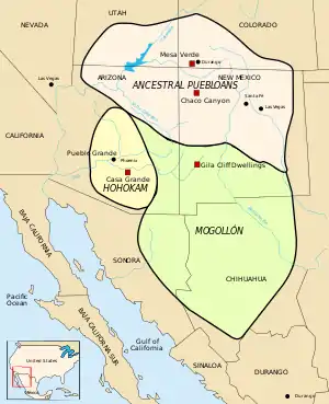 Древние пуэбло были одной из четырёх крупнейших археологических культур юго-запада. Культура анасази имела много общих черт с культурой могольон ввиду близости ареалов, и в то же время резко отличалась от культур хохокам и патайян. По отношению к соседним культурам древние пуэбло занимали северо-западную часть квадрата.[2] Исторической родиной древних пуэбло считается Колорадское плато, а весь ареал простирается от центра Нью-Мексико до юга Невады. Свидетельства древней культуры пуэбло обнаруживались вплоть до Великих равнин, в области около рек Симаррон и Пекос, а также в бассейне реки Галистео.