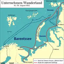 В Тикси экспедиции было приказано задержаться из-за опасности встречи в Карском море с немецким тяжёлым крейсером «Адмирал Шеер», который проводил в Арктике операцию по перехвату советских конвоев. Из Тикси вышли только 19 сентября, приняв в проливе Вилькицкого все меры боевой готовности: советским морякам уже было известно о бомбардировке Диксона и гибели в неравном бою ледокольного парохода «Александр Сибиряков».