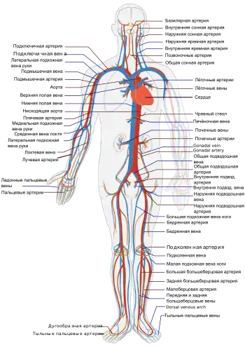 Сердечно-сосудистая система — система органов, состоящая из кровеносных сосудов и сердца, являющегося главным органом этой системы[6]. К основным сосудам относят: