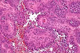 ![]() Микрофотография ангиосаркомы. Окрашено гематоксилином и эозином. | |