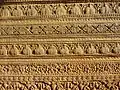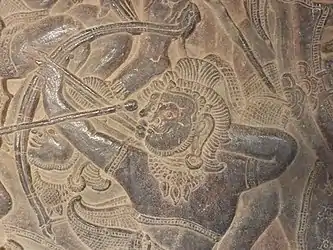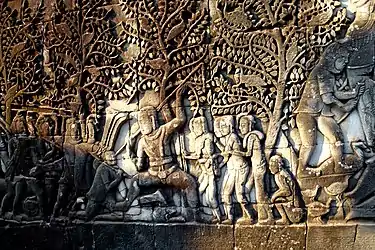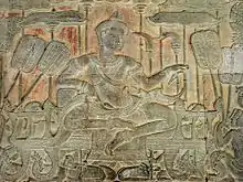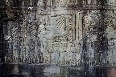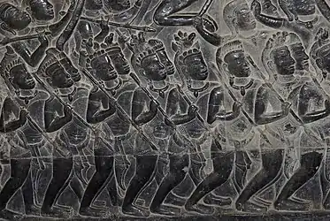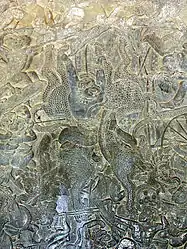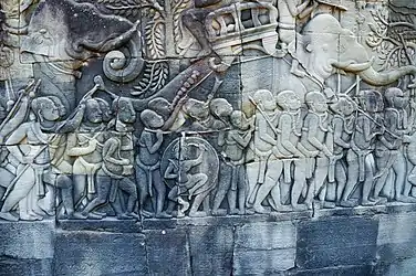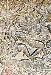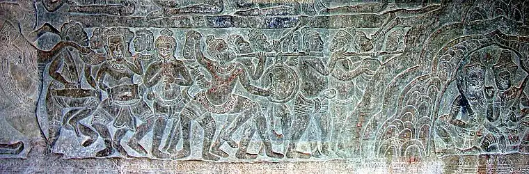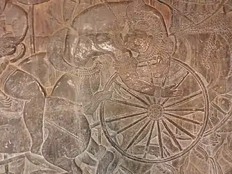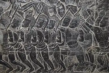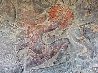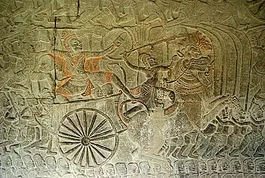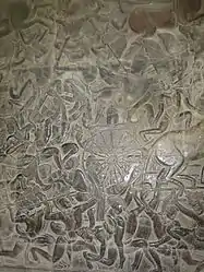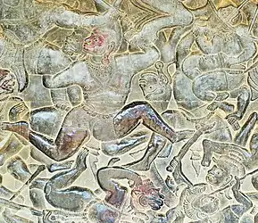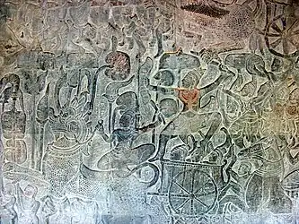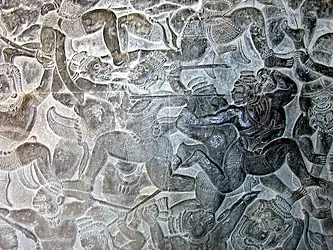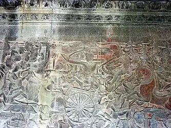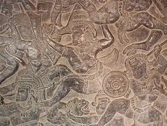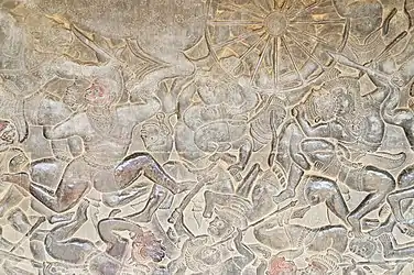 У древних кхмеров рельефу отдавалось предпочтение в сравнении с другими видами декоративной техники. Храмы с глубокой древности имели сложное скульптурное оформление. Шедеврами храмового искусства считаются рельефы ранних храмов: Бантеайсрей (967 год), Бапуон (около 1060 года), Байон (строительство с XII по начало XIII веков). Ангкор-Ват посвящён Вишну и обожествлению Сурьявармана II. Подтверждением тому служат сюжеты настенных барельефов Ангкор-Вата. Аватарам Вишну, Раме и Кришне, посвящены сцены из древнеиндийских эпосов «Рамаяна», «Махабхарата», «Хариванша». Кроме того, стены храма рассказывают о подвигах Сурьявармана II. В изобразительном искусстве Юго-Восточной Азии сложно найти другие примеры столь величественной передачи героических сюжетов[19].