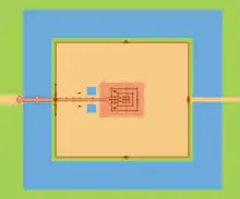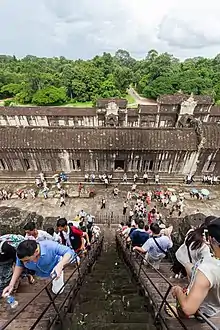 Окружная стена замыкает пространство в 820 тысяч м2, которое помимо главного храма изначально было занято служебными и жилыми постройками, а также к северу от храма, королевским дворцом. Как и остальные мирские здания Ангкора, сооружения были построены из недолговечных материалов и от них ничего не сохранилось, за исключением контуров некоторых улиц[32]. Большая часть пространства в пределах внешней стены в настоящее время покрыта джунглями. Западную башню соединяет с храмом трёхсотпятидесяметровая каменная дорога (платформа) с балюстрадой в виде фигур Наги. Дорога имеет шесть входов в город с каждой стороны. С обеих сторон дороги расположены также так называемые «библиотеки», находящиеся напротив третьих по счёту лестничных сходов, считая от главного храма. Между библиотеками и храмом устроены пруды, которые были добавлены позднее, как и крестообразная терраса, охраняемая фигурами львов, соединяющая каменную дорогу с ядром комплекса[32].
