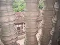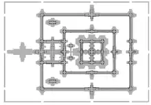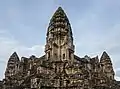 Центральная часть главного храма расположена на трёх связанных между собой мощных террасах (нижняя имеет размеры 197 х 215 метров). Они поднимаются вверх в виде пирамиды с увеличивающейся высотой: их высота составляет, соответственно, 3,5, 7 и 13 метров. Каждая из террас окружена галереей с двускатной кровлей и входом с причудливыми портиками и фронтоном. По углам галерей и в центре ансамбля находятся многоярусные пирамидальной формы башни. Центральная башня-святилище имеет высоту 42 метра и возвышается над уровнем земли на 65 метров. Она предназначалась для хранения (посмертного) изображения дева-раджи (бога-короля). Под ней находится глубокий вертикальный колодец-шахта, где помещались сакральные предметы и, возможно, кремированные останки правителя. Крыши башен и некоторых других построек, по всей видимости, были облицованы золотом[28].