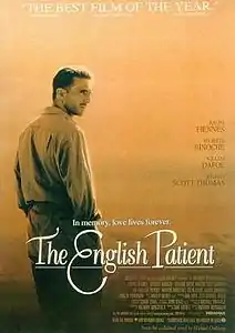 «Англи́йский пацие́нт» (англ. The English Patient) — драматический фильм 1996 года автора сценария и режиссёра Энтони Мингеллы. Картина основана на одноимённом романе Майкла Ондатже, за который он в 1992 году получил Букеровскую премию[5]. Писатель тесно сотрудничал с кинокомпанией во время создания фильма и заявил, что он доволен тем, каким получился фильм. 8 июля 2018 года Майкл Ондатже стал лауреатом «Золотого Букера», роман признан лучшим из произведений, которые за последние 50 лет удостаивались Букеровской премии[6]. Главные роли исполнили Рэйф Файнс в образе графа Ласло Алмаши, Кристин Скотт Томас в образе Кэтрин Клифтон и Жюльет Бинош в образе медсестры Ханны. Во второстепенных ролях снялись Уиллем Дефо, Навин Эндрюс, Колин Фёрт, Кевин Уотли, Юрген Прохнов, Джулиан Уэдхем, Рэймонд Култхард и Доминик Мафэм.