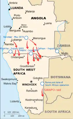 Южноафриканские военные атаковали повстанцев в провинции Кунене 12 мая 1980 года. Министерство обороны Анголы обвинило правительство ЮАР в ранении и убийстве мирных жителей. Девять дней спустя Южно-Африканские силы обороны снова атаковали, на этот раз в Квандо-Кубанго, и МПЛА пригрозило ответить военным путем. 7 июня 1980 года Южно-Африканские силы обороны начали полномасштабное вторжение в Анголу через Кунене и Квандо-Кубанго, уничтожив 13 июня оперативный штаб СВАПО, что премьер-министр ЮАР Питер Виллем Бота назвал «шоковой атакой». Правительство Анголы арестовало 120 ангольцев, которые планировали подорвать взрывчатку в Луанде 24 июня, сорвав заговор, якобы организованный правительством ЮАР. Три дня спустя Совет Безопасности ООН собрался по просьбе посла Анголы в ООН и осудил вторжение ЮАР в эту страну. Президент Заира Мобуту Сесе Секо также встал на сторону МПЛА. Правительство Анголы зафиксировало 529 случаев нарушения южноафриканскими войсками территориального суверенитета страны в период с января по июнь 1980[13].