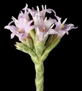 Цветки одиночные или собранные в колосья, чашечка окрашенная, пятидольная, венчик сросшийся, пятидольный, пурпурный, по краям щетинистый, тычинок пять.