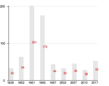 | 1838 | 1862 | 1961 | 1965 | 1997 | 2002 | 2007[22] |