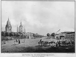 В следующем 1729 году состоялась закладка церкви, совершенная преосвященным Питиримом, архиепископом нижегородским. Деревянная церковь была построена в период с 1729 по 1731 год архитектором Дж. Трезини.[1]