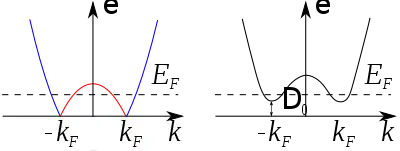 На рисунке показаны дисперсионные соотношения для случая металла и сверхпроводника[6].