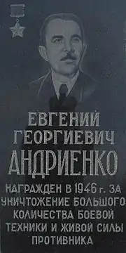 Евгений Георгиевич Андреенко (2 сентября 1917 — 14 сентября 1982) — участник Великой Отечественной войны, лётчик 20-го гвардейского бомбардировочного авиационного полка (13-я гвардейская бомбардировочная авиационная дивизия, 2-й гвардейский бомбардировочный авиационный корпус, 18-я воздушная армия) гвардии старший лейтенант. Герой Советского Союза (1946).