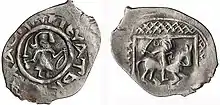 Денга: левая сторона: «Воин анфас, в левой руке сабля, под правой рукой небольшой округлый щит, на поясе ножны, над рукой со щитом отрубленная человеческая голова, под рукой с саблей орнаментальная решётка в круговой легенде с именем Андрея». Оборотная сторона: «Четвероногое вправо, голова повернута влево, хвост пропущен между задними ногами и над спиной оканчивается трилистником, над задней частью туловища отрубленная человеческая голова, над передней – значок в виде перевернутой буквы С. Изображение помещено в прямоугольную рамку, вписанную в круговой линейный ободок»[4].