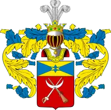 Описание герба: Щит имеет вершину, составленную крестообразно из золота и голубого цвета, посредине которой находится шестиугольная звезда переменных с полями цветов. В нижнем красном пространном поле означены шпага и карабин, крестообразно проходящие сквозь серебряную луну. Щит увенчан дворянскими шлемом и короной со страусовыми перьями. Намёт на щите золотой, подложенный голубым.