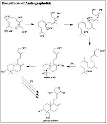 С помощью избирательно меченых C13 предшественников андрографолида как по пути MVA, так и по пути DXP, было определено, что большинство предшественников андрографолида синтезируется через путь DXP, кроме того, небольшая часть предшественников андрографолида синтезируется посредством пути MVA. Биосинтез андрографолида начинается с добавления IPP к DMAPP, который образует геранилпирофосфат. Затем к нему добавляется другая молекула IPP, и получается фарнезилпирофосфат (FPP). Конечная молекула IPP добавляется к FPP для завершения основной цепи дитерпена. Двойная связь, оставшаяся в этой молекуле от DMAPP, окисляется до эпоксида вплоть до замыкающего кольцо каскада, при этом образуется два шестичленных кольца. Ряд окислений образует пятичленный лактон в дополнение к добавлению спиртовых групп. Порядок следования этих модификаций, происходящих после синтеза, не выяснен[8].