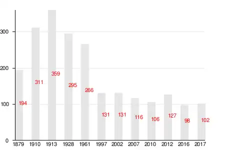 Число жителей по семейным спискам 1879 г.: 90 м. п., 104 ж. п.; по приходским сведениям 1879 г.: 90 м. п., 101 ж. п.[2]
