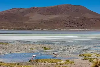 В регионе пуна солёные озёра можно разделить на две группы: глубокие озёра средней солёности, на которых обитают водоплавающие птицы, преимущественно утки, лысухи, поганки, и неглубокие сверхсолёные озёра, на которых обитают фламинго[20]. Озёра могут быть покрыты солёной или гипсовой коркой, под которой находится жидкая грязь[6]. Обычно глубина водоёмов не превышает одного метра. Зачастую они являются остатками более крупных озёр, сохранившихся в регионе с плейстоцена[19]. Останки андского фламинго, обнаруженные на границе солончака Салар-де-Атакама, относятся к 3000—2200 годам до настоящего времени, когда климатические условия в регионе уже были схожими с современными[23].