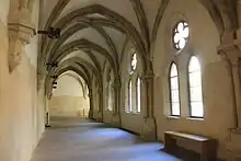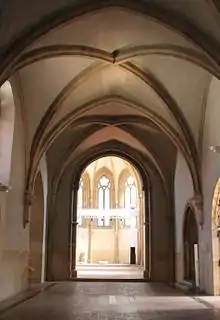 Трапезная и скрипторий были объединены в одно помещение, разделенное на 2 части полукруглыми арками, опирающихся на низкую центральную колонну, где каждая часть помещения была оснащена собственным порталом в западной стене. Отличительной особенностью является то, что каждая часть имеет разные окна и профиль арок, опирающихся на центральную колонну. В северной стене трапезной находился в полукруглый портал, ведущий к хозяйственной части, а в левом углу была винтовая лестница, ведущая в покои клариссинок.