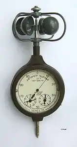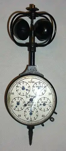 Нижний конец оси соединён с помощью червячной передачи с колёсным механизмом, передающим движение на стрелки. Соответственно расположению зубчатых колёс, на циферблате имеются три стрелки со шкалами единиц, сотен и тысяч оборотов.