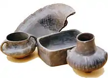 На протяжении 4 периодов существования культуры в ней появились 3 типа керамики. Первый представлял собой сосуды с тонкими стенками светлых цветов (благодаря обжигу) с добавлением крупинок слюды. Второй тип: грубые, без орнамента. Третий: более редкий, представлял собой также грубые сосуды, с толстыми стенками, однако изготовленные из глины, смешанной с раздробленной галькой. На фазах I и III преобладала красная керамика, тогда как на фазе IV керамика была серой и чёрной. Керамика фазы II характеризуется серым и коричневым цветом, а также ребристым орнаментом. Сосуды фазы I часто украшены белой краской в виде полос, треугольников и растительного орнамента.