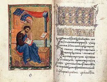 - четыре больших заставки перед каждым из Евангелий. Они созданы в балканском стиле, представляют сложное переплетение кругов и ромбов. При их создании использована широкая палитра цветов (синий, зелёный, жёлтый, оранжевый), а также золото.