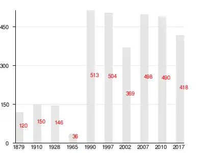 Число жителей по семейным спискам 1879 г.: 58 м. п., 62 ж. п.; по приходским сведениям 1879 г.: 57 м. п., 62 ж. п.[4]