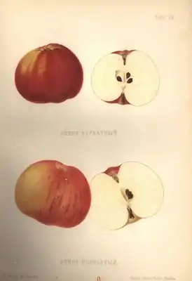 Плоды яркие, красивые: на зеленоватом фоне — разлитый румянец, покрывающий плод почти полностью[2]. По другим данным: кожица при съёме плодов зеленоватая, далее слегка желтеет. Покровная окра-ска в виде слабых нередко сливающихся тускло розовых и красных полос[1]. Масса плода 60 г. По другим данным: 70 г, максимум 90 г, плоскоокруглой, репчатой формы, иногда слег-ка конические у вершины. Срок потребления: от летнего до раннезимнего, плоды хранятся 45-60 дней[1]. В до февраля-марта.
