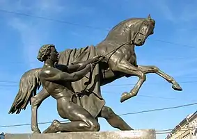 За образец Клодт взял «Коней Марли» (1743—1745), произведение французского скульптора Гийома Кусту (хранятся в парижском Лувре, копии установлены на Площади Согласия у начала Елисейских полей). Парные скульптурные группы работы Кусту восходят к античным оригиналам: изображениям Диоскуров на Капитолии и на Квиринальской площади в Риме. В 1833 году скульптор П. К. Клодт представил свой проект: этюды в гипсе. Но этот проект не был осуществлён[83]. Коней заменили медные львы и порфировые вазы[47].