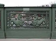 Старый узкий мост был разобран и на его месте был построен трёхпролётный каменный мост, перекрытый кирпичными сводами, очерченными по пологой круговой кривой[46]. Опоры моста и пролёты облицевали розовым гранитом. Литая чугунная ограда с барельефами морских коньков и русалок выполнена архитектором А. П. Брюлловым[20][46] по мотивам решётки, созданной архитектором Карлом Шинкелем для Дворцового моста в Берлине[47][3][48]. Газета «Северная пчела» 5 (17) ноября 1841 года сообщала, что чугунная решётка отлита «по образцу рисунка знаменитого берлинского архитектора Шинкеля»[49].