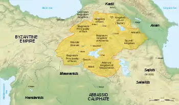 К началу IX века бывшие территории Камсараканов в Аршарунике и Шираке, включая Ани, были включены в состав земель династии Багратидов[16]. Их сюзерен, Ашот IV Мсакер (806—827) получил титул ишханац ишхана (князя князей) Армении от Халифата в 804 году[17]. Первой столицей Багратидов стал Багаран, расположенный примерно в 40 км на юг от Ани, второй — Ширакаван, в 25 км от Ани, а в 929 году столицей стал Карс. В 961 году Ашот III (953—977) сделал столицей Ани[18]. В правление Смбата II (977—989) Ани быстро рос. В 992 году католикосат также переехал в этот город. В X веке население города составляло от 50 до 100 тыс. человек[19].