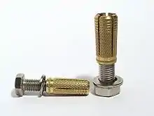 - Трение — нагрузки, воспринимаемые анкером, передаются на материал основания посредством трения тела анкера о материал основания. Для этого необходимо наличие распирающей силы. Эта сила может создаваться, например, за счёт распора металлической цанги или пластикового дюбеля.