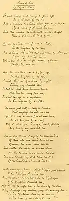 «Аннабе́ль Ли» (англ. Annabel Lee) — последнее из написанных Эдгаром Алланом По стихотворений. Как и во многих иных поэтических произведениях По, оно развивает тему гибели молодой женщины. Рассказчик, который влюбляется в Аннабель Ли ещё в юности, любит её с такой силой, что даже ангелы начинают завидовать. Любовь к ней не умирает даже после её смерти. Существовали споры о прототипе, если таковой вообще имел место, вдохновившем автора на создание образа Аннабель Ли. Несколько женщин рассматривались, но наиболее вероятной была жена писателя, Вирджиния Элиза Клемм. Стихотворение было написано в 1849 году, но опубликовано лишь после смерти писателя в том же году.