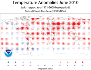 - June, April to June, and Year-to-Date Global Temperatures are Warmest on Record, NOAA, 15.07.2010. (недоступная ссылка). Дата обращения: 18 июля 2010. Архивировано 17 июля 2010 года.