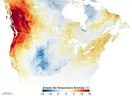 Волна жары затронула Северную Калифорнию, Айдахо, Западную Неваду, Орегон и Вашингтон в Соединённых Штатах, а также Британскую Колумбию и, на последней стадии, Альберту, Манитобу, Северо-Западные территории, Саскачеван и Юкон, всю территорию Канады.[18] Волна жары возникла из-за исключительно сильного хребта, сосредоточенного в этом районе, вызванного последствиями глобального потепления.[19][20] Это привело к самым высоким температурам, когда-либо зарегистрированных в регионе,[21] включая самую высокую температуру, когда-либо измеренную в Канаде, — 49,6 °C (121.3 °F).[22] Точное число погибших неизвестно, и оно растёт. 6 июля предварительные статистические данные, опубликованные Коронерской Службой Британской Колумбией указали, что в провинции произошло на 610 внезапных смертей больше, чем обычно, и в провинции Альберта за неделю аномальной жары зарегистрировано 66 случаев избыточной смертности;[23][24] главный коронёр Британской Колумбии позже сказал, что в течение недели между С 25 июня по 1 июля было подтверждено, что 569 смертей произошли по причинам, связанным с жарой.[25] Подтверждённые случаи смерти в Соединённых Штатах включают по меньшей мере 116 случаев в Орегоне (из которых 72 находятся в округе Малтнома, в который входит Портленд,[26][27][28] по крайней мере, 112 в Вашингтон[29]и одна смерть в Айдахо;[30]анализ, проведённый «Нью-Йорк Таймс», предполагает, что в течение недели, когда волна жары прошла через Вашингтон и Орегон, произошло около 600 избыточных смертей.[31]